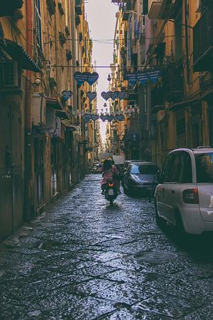 Naples, Italy - an urban shot of a narrow street with stones wet from rain a woman is riding on the back of a motorcycle holding on to the person in front. The street is strung with across with blue hearts with Italian sayings on them.